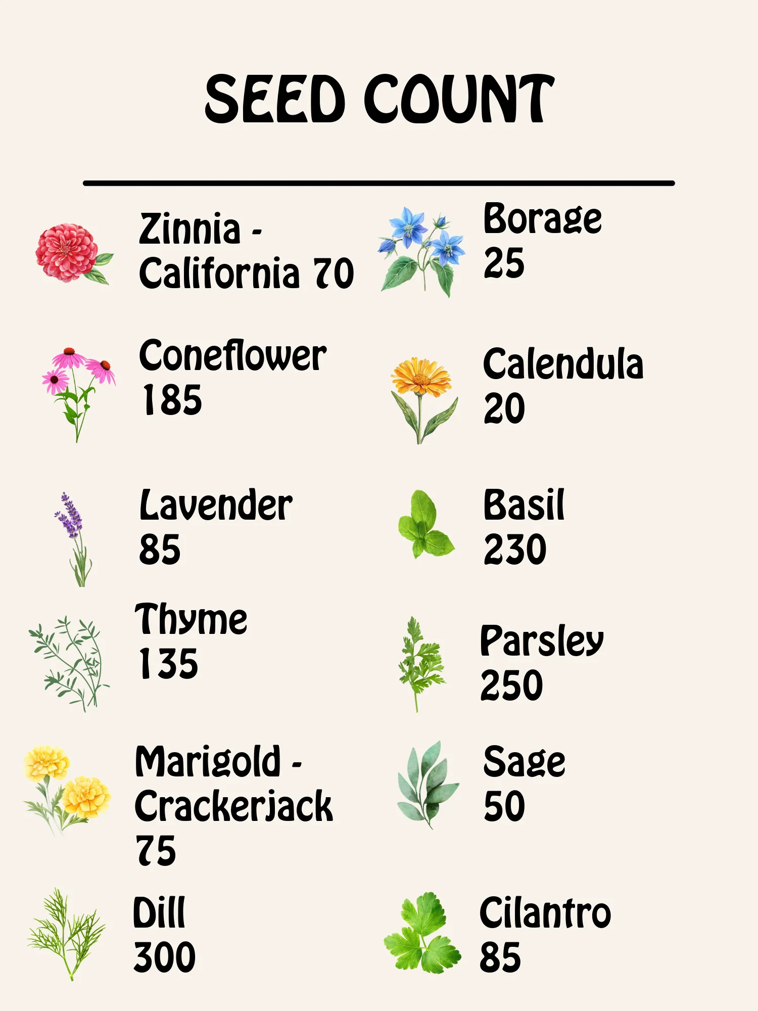 - This set includes: Calendula, Coneflower, Marigold Crackerjack, Lavender, Zinnia California Giant, Borage, Sage, Basil, Thyme, Cilantro, Parsley, & Dill.